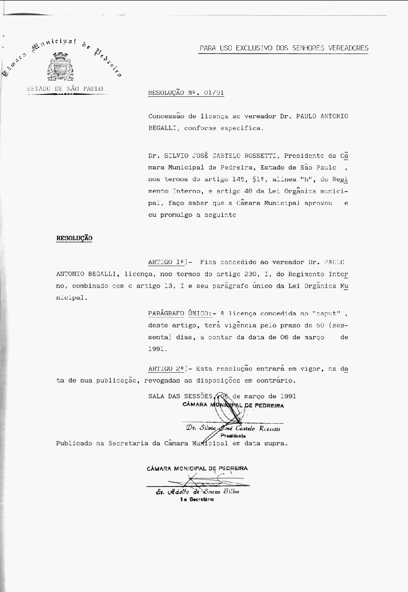 Ementa: Concessão de licença ao vereador Dr. Paulo Antonio Begalli, conforme especifica.
