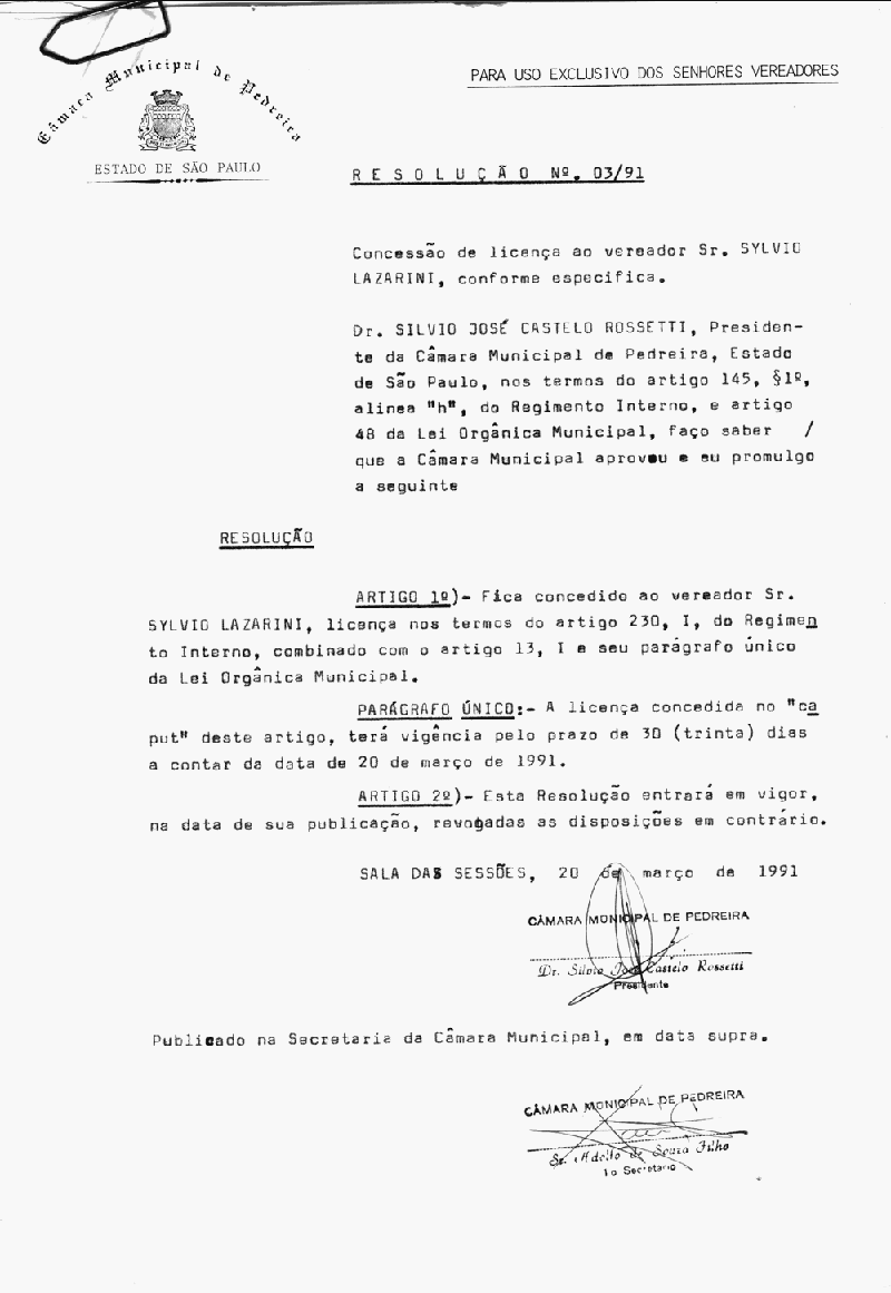 Ementa: Concessão de licença ao vereador Sr. Sylvio Lazarini, conforme especifica.