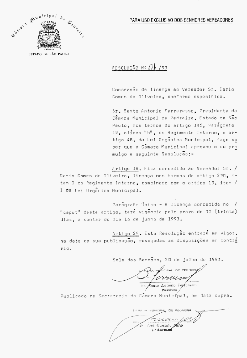 Ementa: Concessão de licença ao vereador sr. Dario Gomes de Oliveira, conforme especifica.