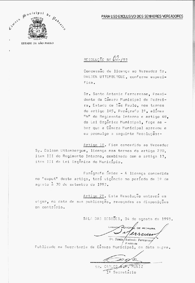 Ementa: Concessão de licença ao vereador Sr. Dalson Uttembergue, conforme especifica.