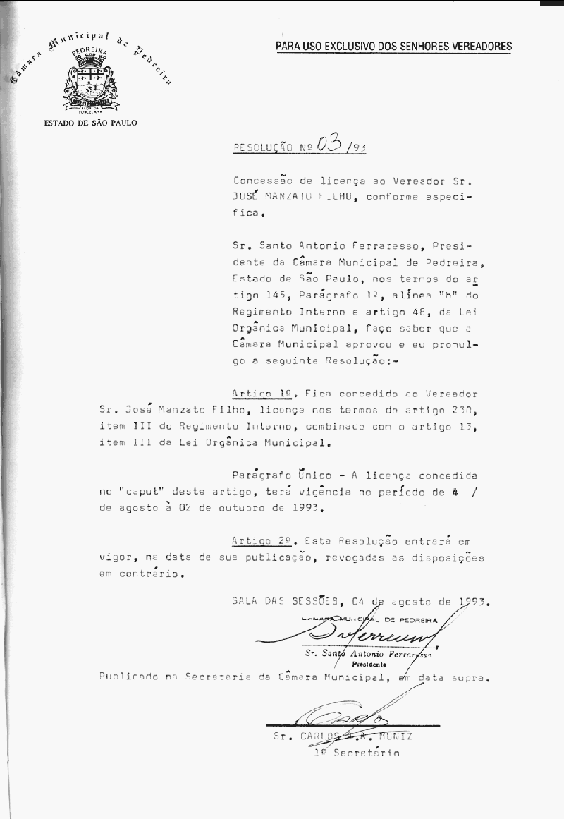 Ementa: Concessão de licença ao vereador sr. José Manzato Filho, conforme especifica.