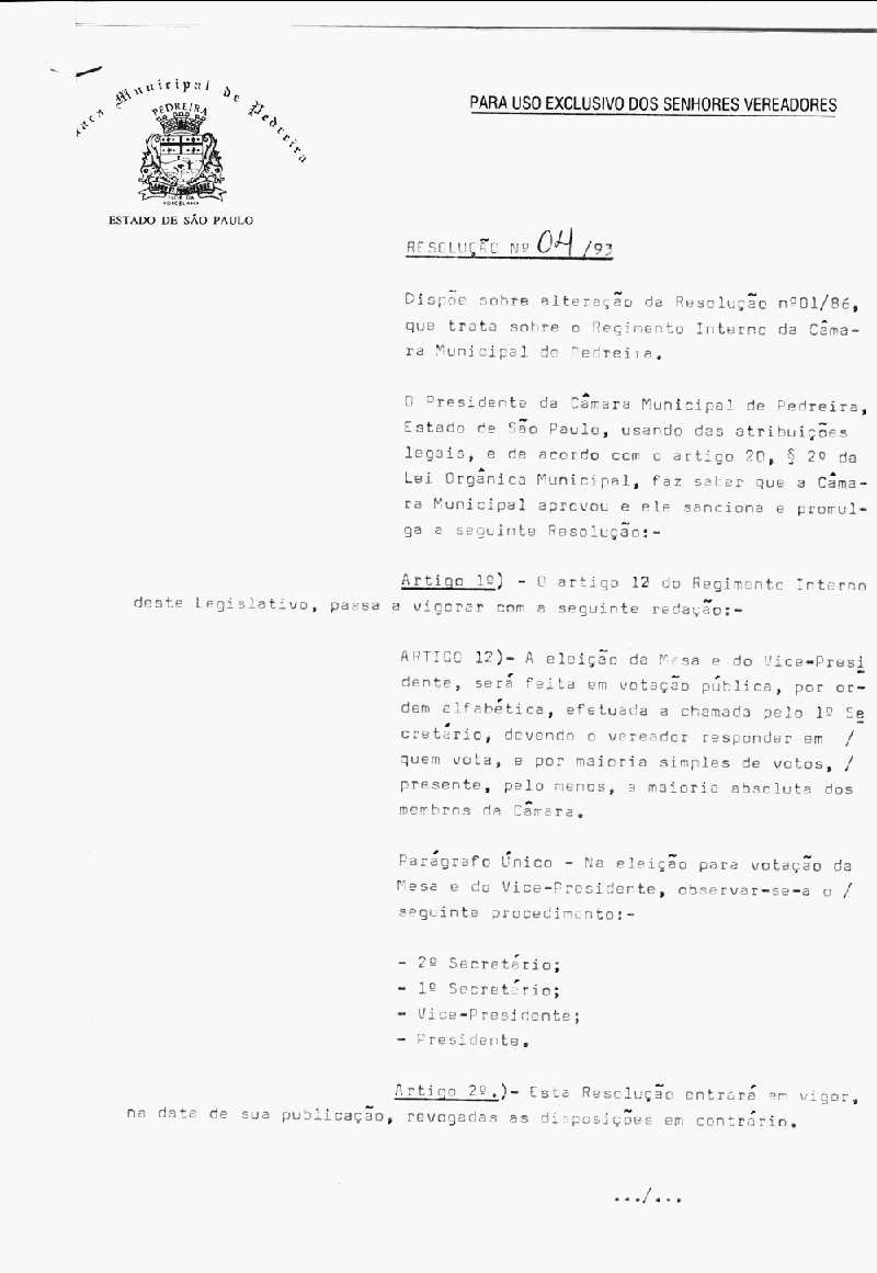 Ementa: Dispõe sobre alteração da Resolução nº 01/86, que trata sobre o Regimento Interno da Câmara Municipal de Pedreira.