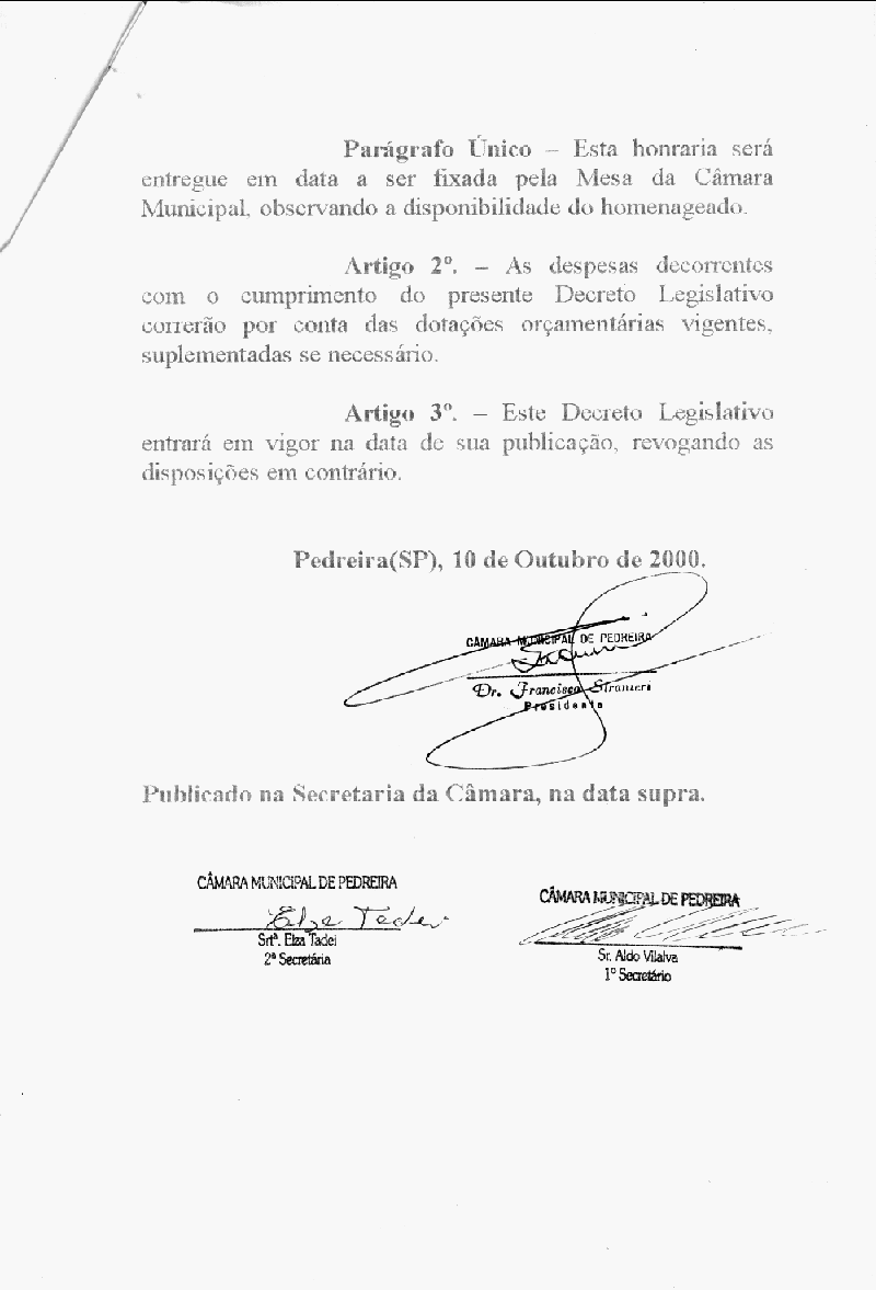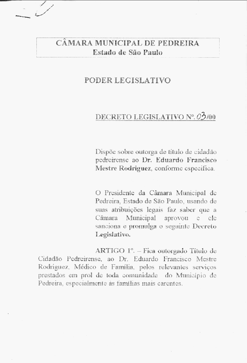 Ementa: Dispõe sobre outorga de título de cidadão Pedreirense, ao Dr. Eduardo Francisco Mestre Rodriguez, conforme especifica
