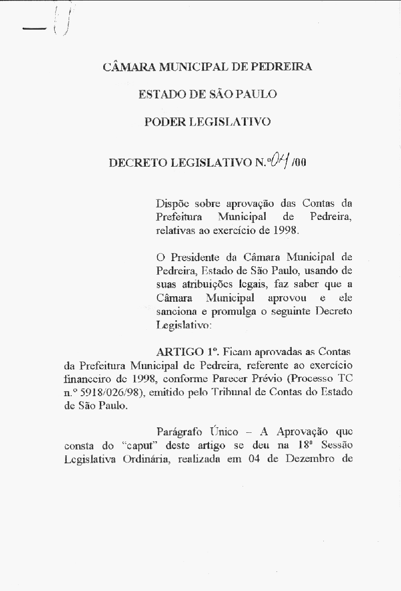Ementa: Dispõe sobre aprovação das Contas da Prefeitura Municipal de Pedreira, relativas ao exercício de 1998