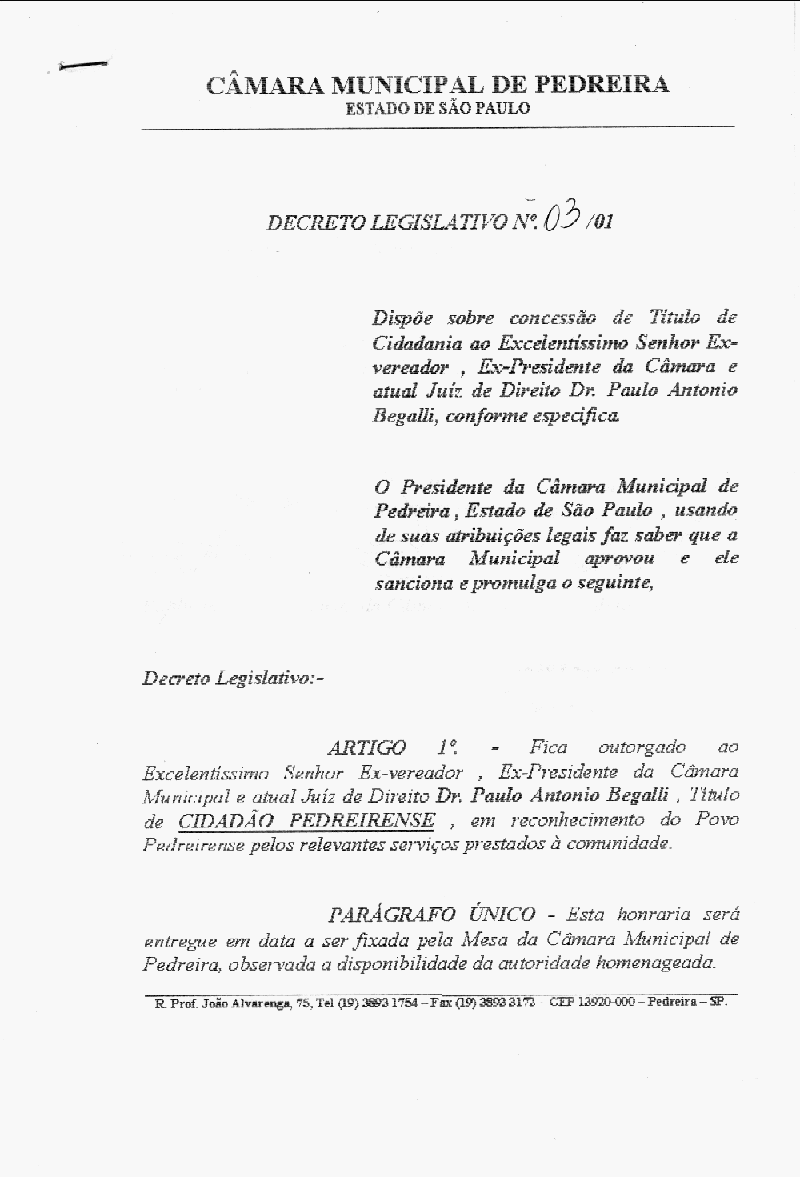 Ementa: Dispõe sobre concessão de título de Cidadania ao Excelentíssimo Senhor Ex-vereador, Ex-Presidente da Câmara e atual Juiz de Direito Dr. Paulo Antonio Begalli, conforme específica