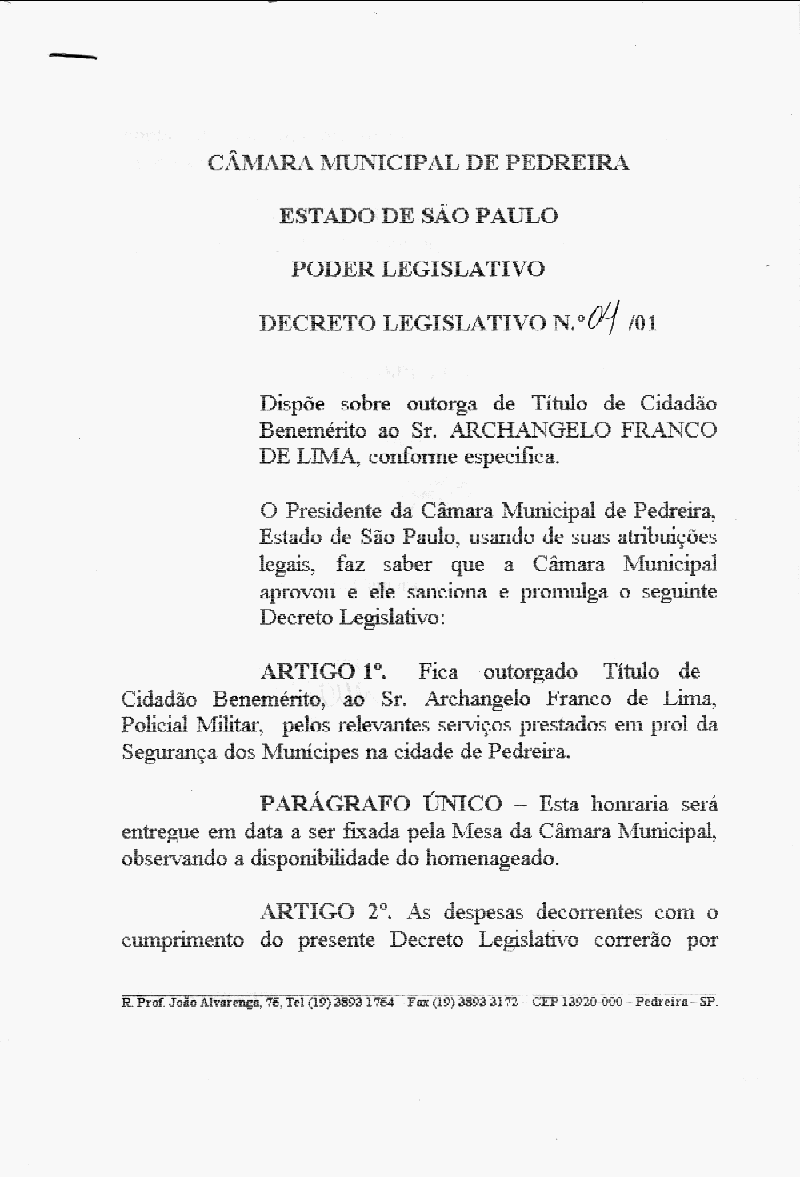 Ementa: Dispõe sobre concessão de título de Cidadão Benemérito ao Sr. Archangelo Franco de Lima, conforme específica