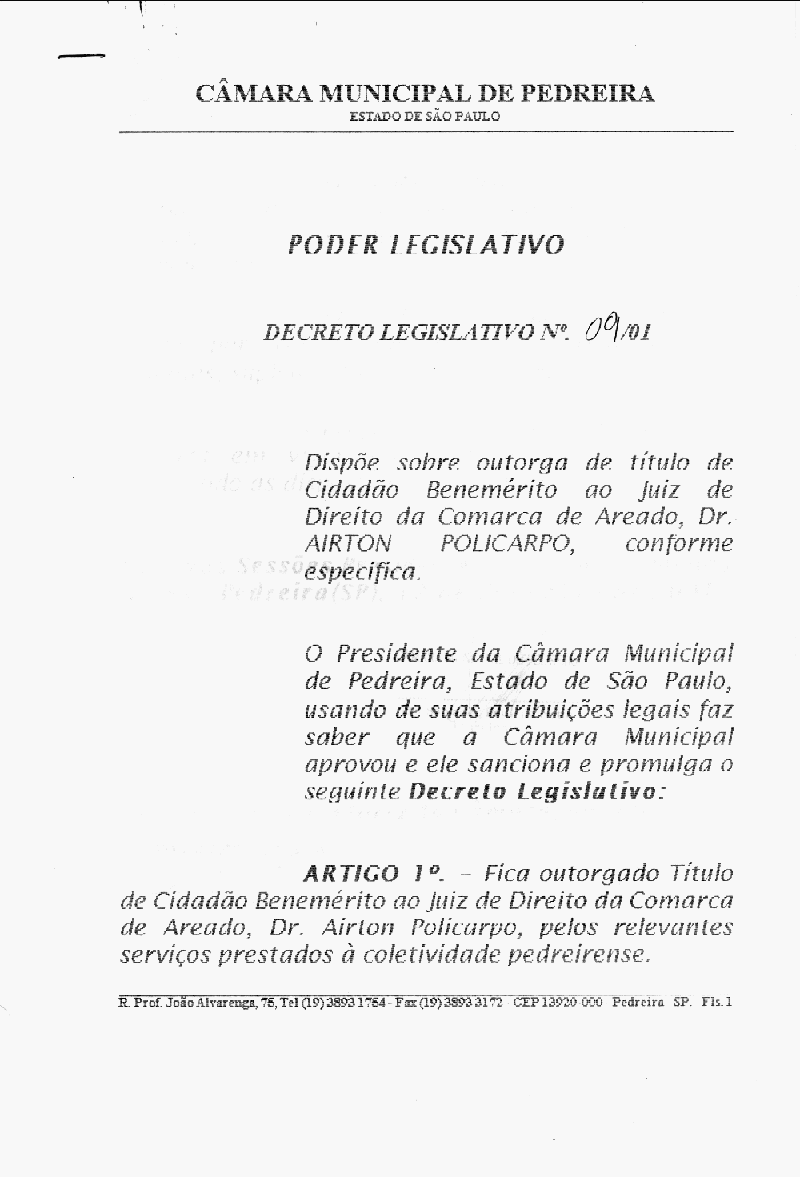 Ementa: Dispõe sobre outorga de título de cidadão Benemérito ao Juiz de Direito da Câmara de Areado, Dr. Airton Policarpo, conforme específica