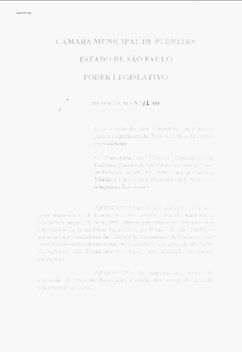 Ementa: Fixa o subsídio dos vereadores da Câmara para a legislatura de 2001 a 2004 e dá outras providências.