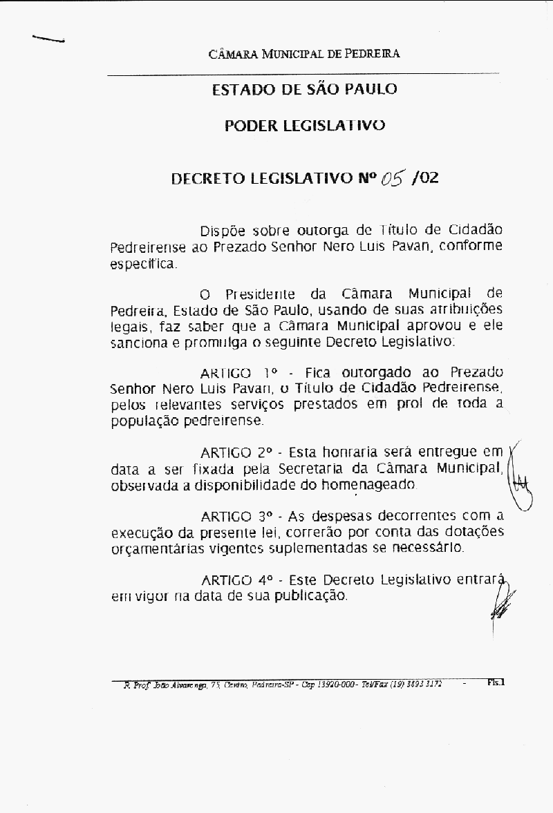 Ementa: Dispõe sobre outorga de título de cidadão Pedreirense ao Prezado Sr. Nero Luis Pavan, conforme específica