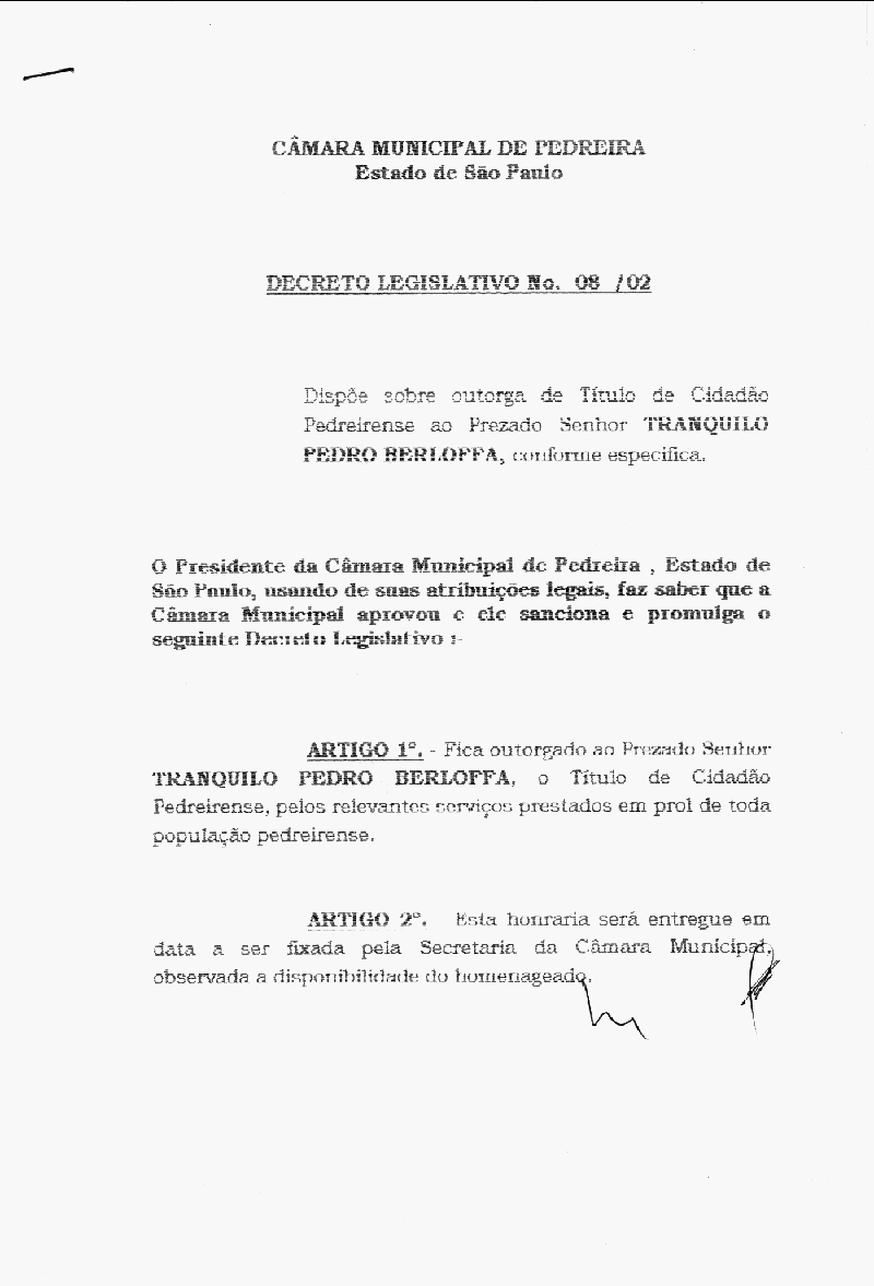 Ementa: Dispõe sobre outorga de título de cidadão Pedreirense ao Prezado Sr. Tranqüilo Pedro Berloffa