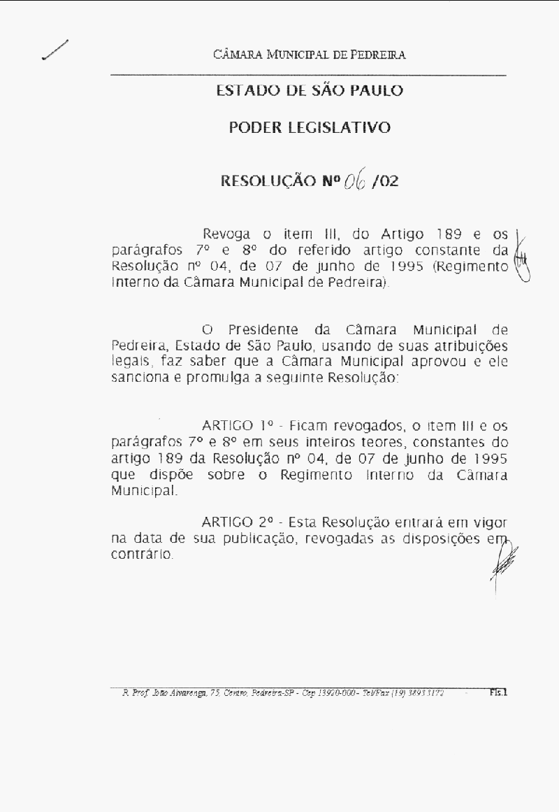 Ementa: Revoga o item III, do Artigo 189 e os parágrafos 7º e 8º do referido artigo constante da Resolução nº 04, de 07 de junho de 1995 (Regimento Interno da Câmara Municipal de Pedreira).