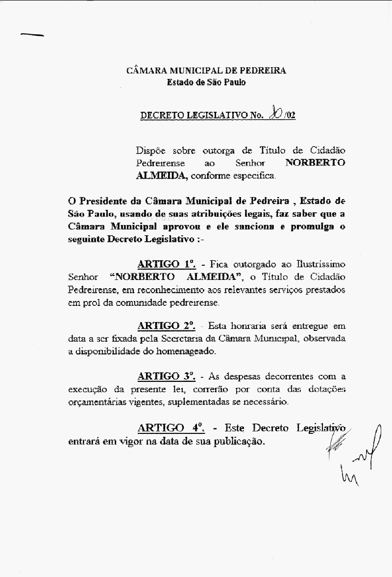 Ementa: Dispõe sobre outorga de título de cidadão Pedreirense ao Sr. Norberto Almeida, conforme específica