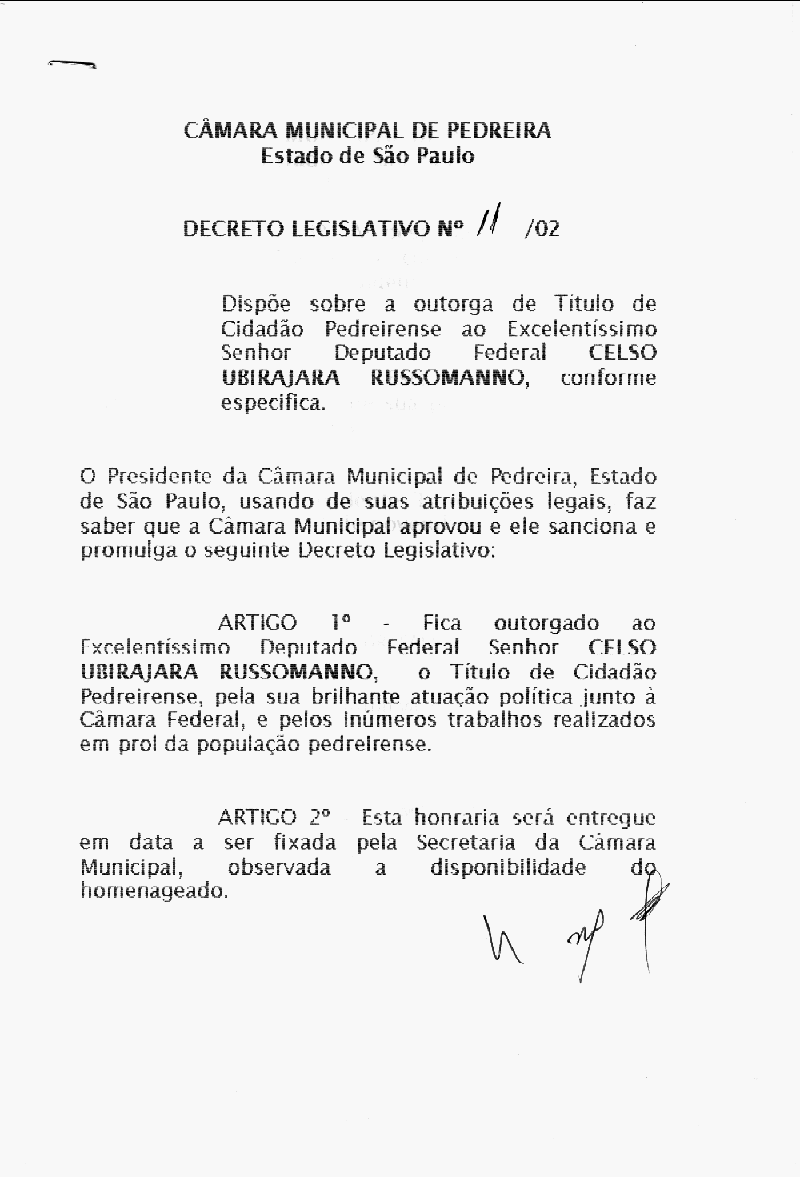 Ementa: Dispõe sobre outorga de título de cidadão Pedreirense ao Excelentíssimo Sr. Deputado Federal Celso Ubirajara Russomanno, conforme especifica