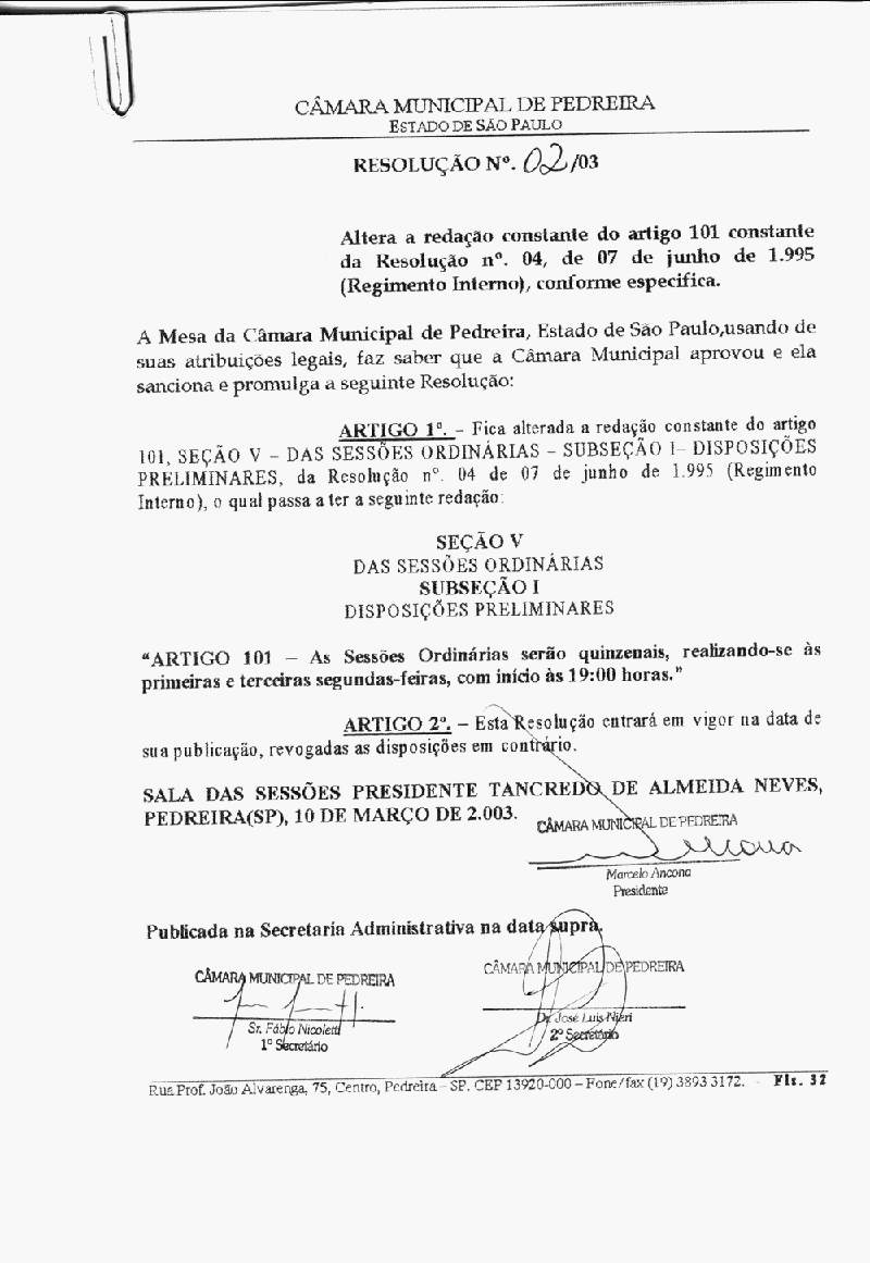 Ementa: Altera a redação constante do artigo 101 constante de Resolução nº 04, de 07 de junho de 1995 (Regimento Interno), conforme especifica.