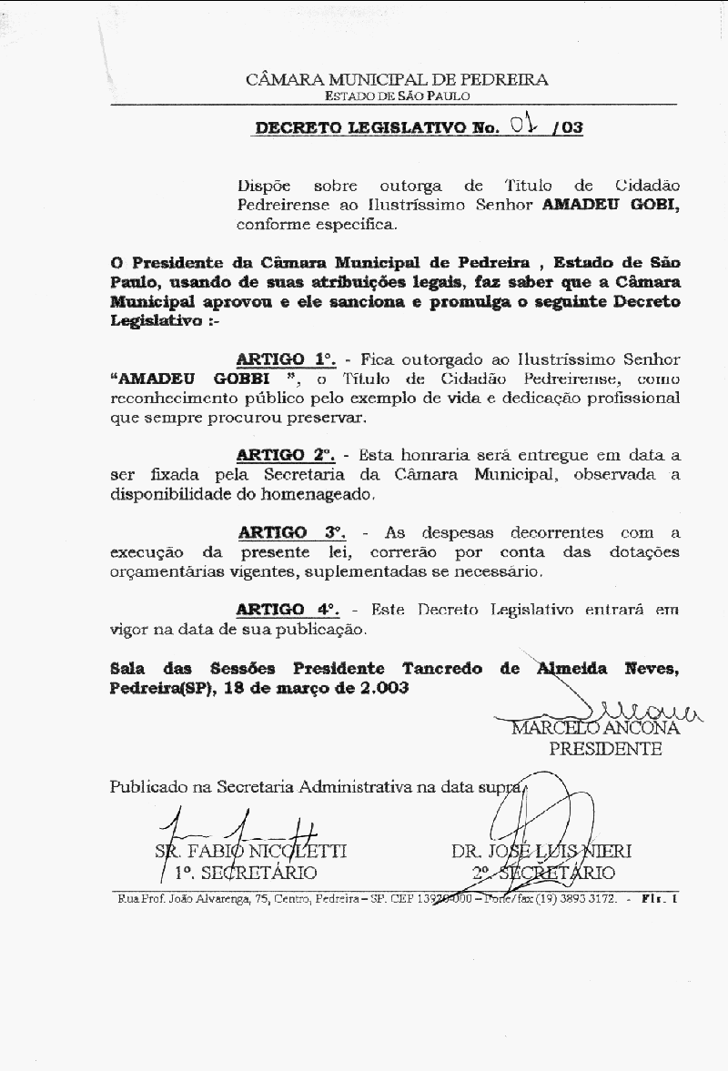 Ementa: Dispõe sobre outorga de título de cidadão Pedreirense ao Ilustríssimo Sr. Amadeu Gobi, conforme especifica