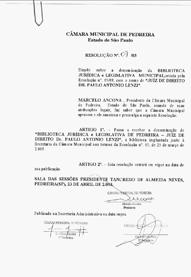 Ementa: Dispõe sobre a denominação da Biblioteca Jurídica e Legislativa Municipal, criada pela resolução nº 05/03, com o nome de "Juiz de Direito Dr. Paulo Antonio Lenzi".