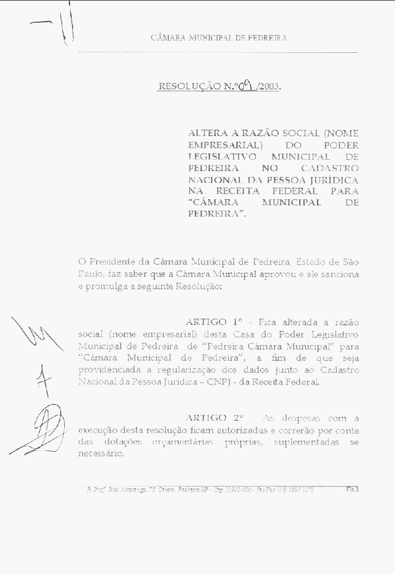 Ementa: Altera a razão social (nome empresarial) do Poder Legislativo Municipal de Pedreira no cadastro nacional da pessoa jurídica na receita federal para "Câmara Municipal de Pedreira".