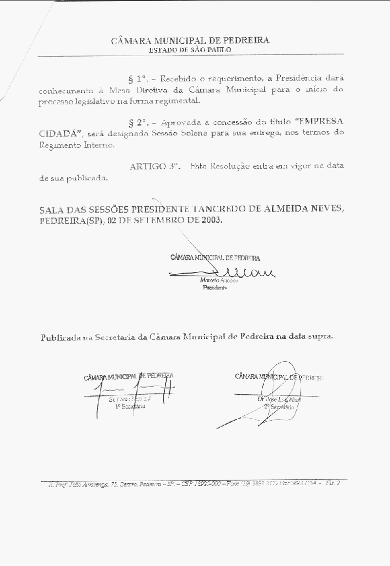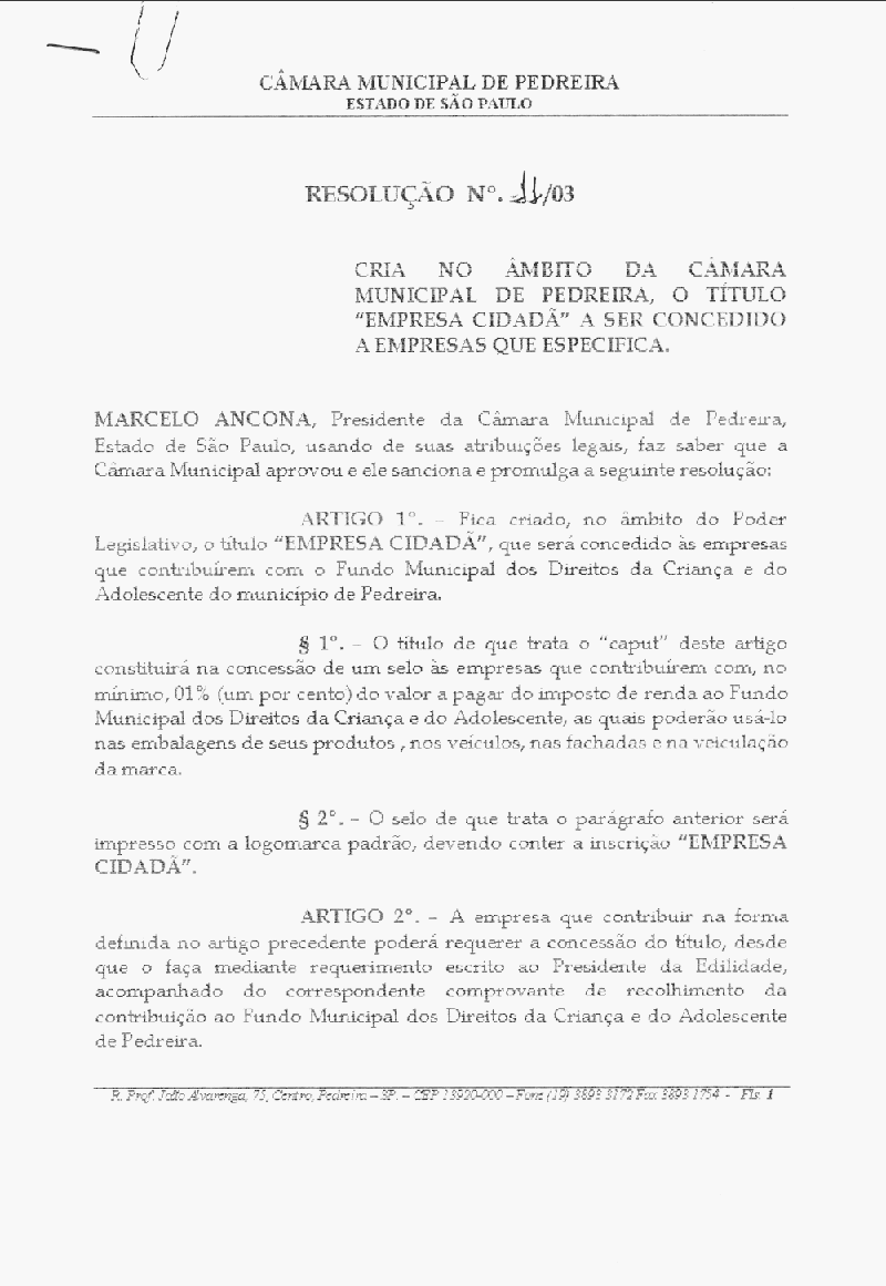 Ementa: Cria no âmbito da Câmara Municipal de Pedreira, o título "Empresa Cidadã" a ser concedido a empresas que especifica.