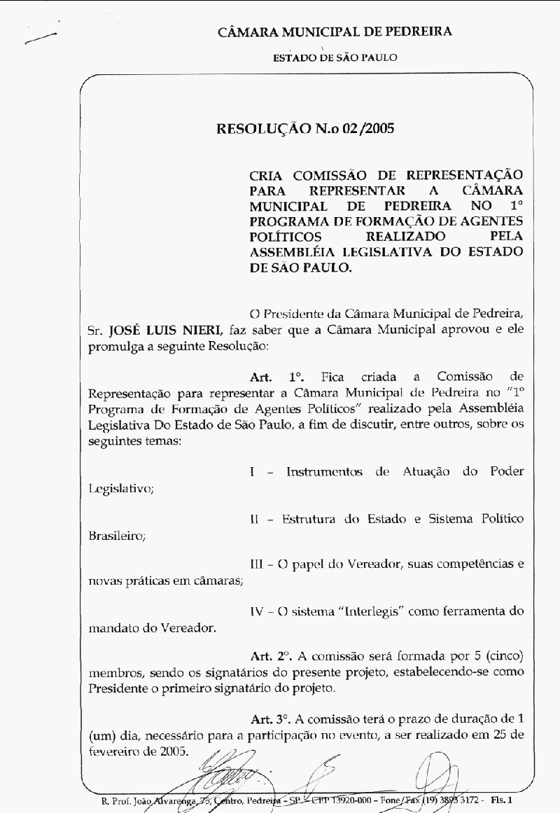 Ementa: Cria Comissão de Representação para representar a Câmara Municipal de Pedreira no 1° programa de Formação de Agentes Políticos realizado pela Assembléia Legislativa do Estado de São Paulo