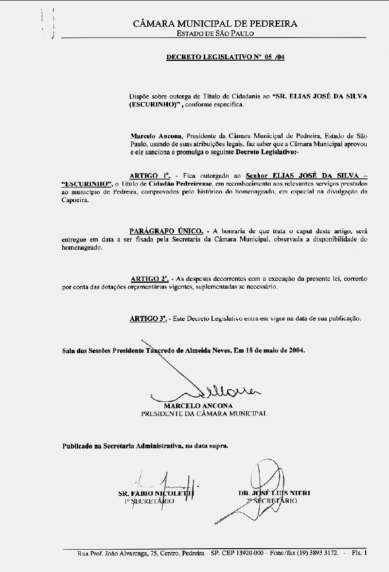 Ementa: Dispõe sobre outorga de Titulo de Cidadania ao "Sr. Elias José da Silva (Escurinho)", conforme especifica