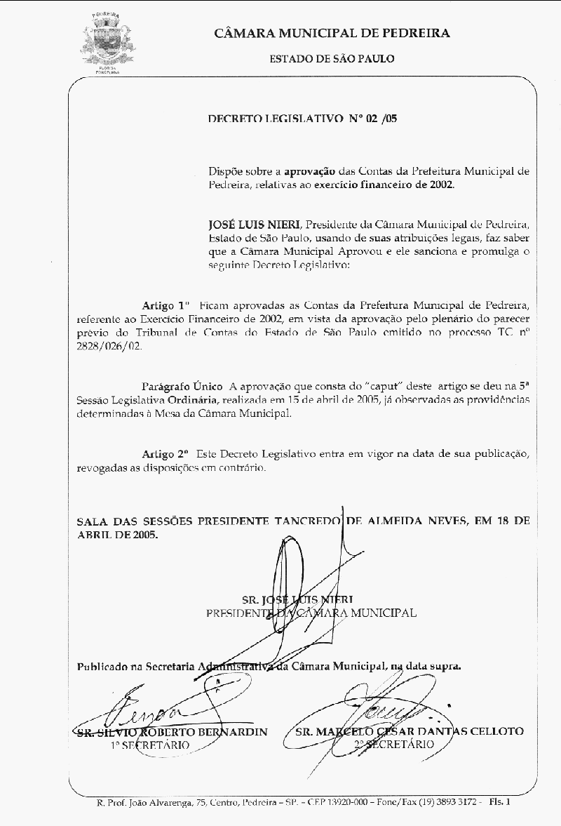 Ementa: Dispõe sobre a aprovação das Contas da Prefeitura Municipal de Pedreira, relativas ao exercício financeiro de 2002