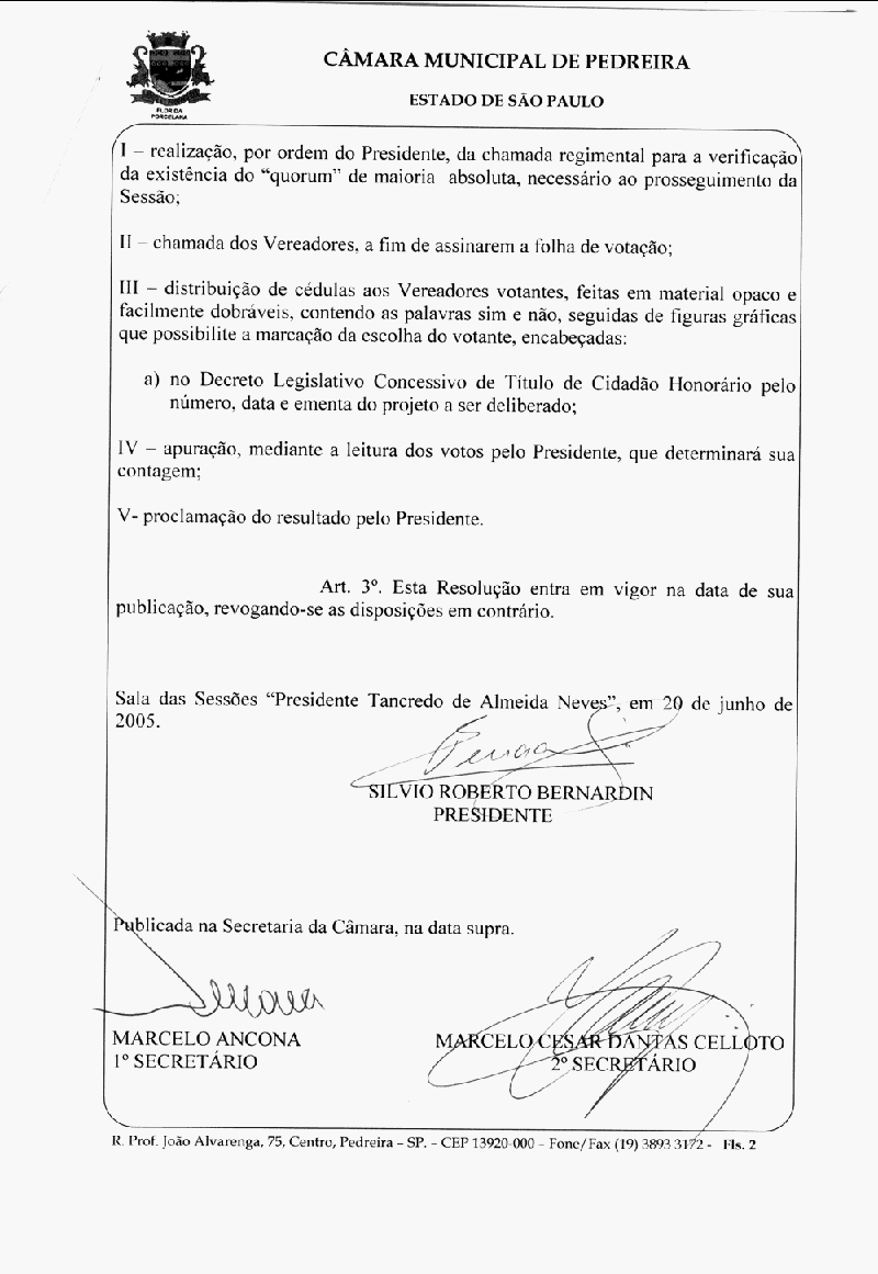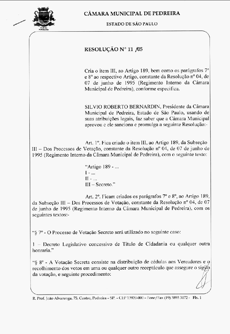 Ementa: Cria o item III, ao artigo 189, bem como os parágrafos 7º e 8º ao respectivo Artigo, constante da Resolução nº 04, de 07 de junho de 1995 (Regimento Interno da Câmara Municipal de Pedreira), conforme especifica.