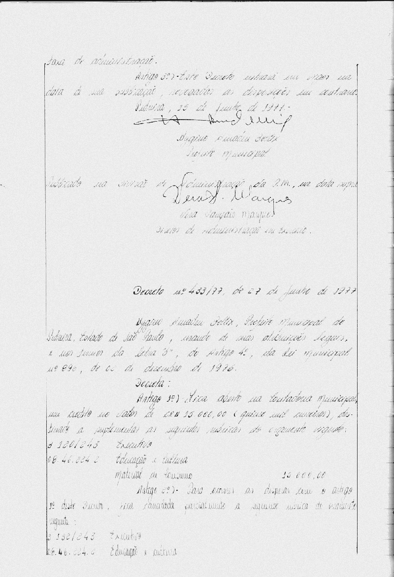 Ementa: Artigo 1° - Fica aberto na Contadoria Municipal, um crédito no valor de Cr$ 15.000,00 (quinze mil cruzeiros) destinados a suplementar as seguintes rubricas do orçamento vigente