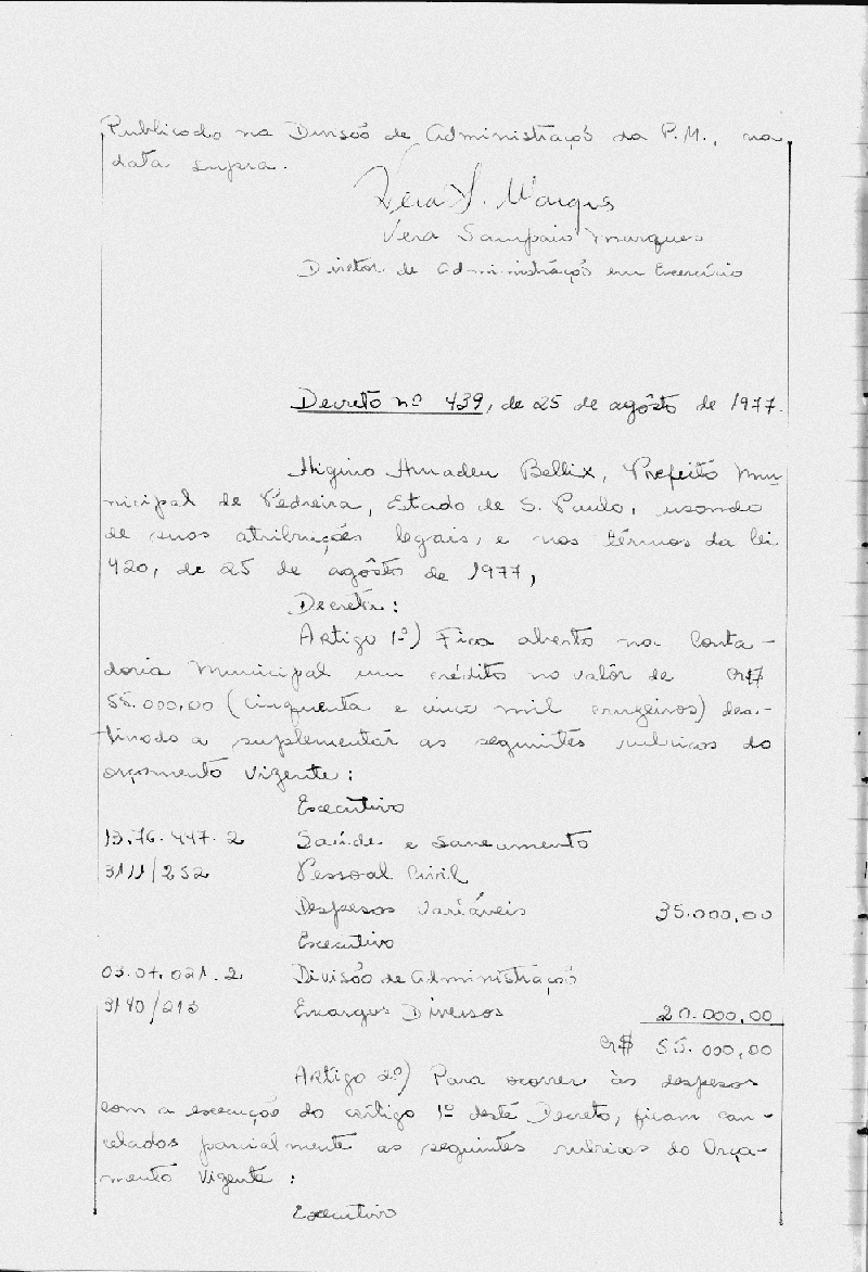Ementa: Artigo 1° - Fica aberto na Contadoria Municipal, um crédito no valor de Cr$ 55.000,00 (cinquenta e cinco mil cruzeiros) destinados as seguintes rubricas ao orçamento vigente