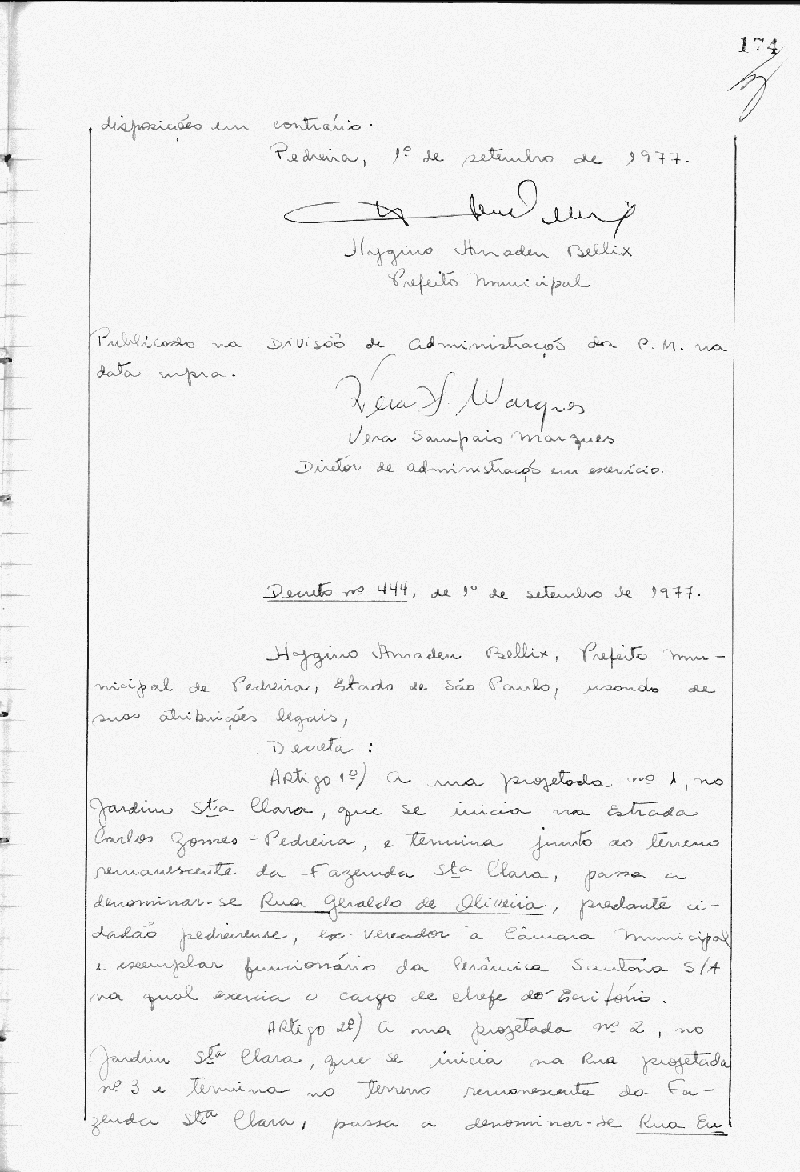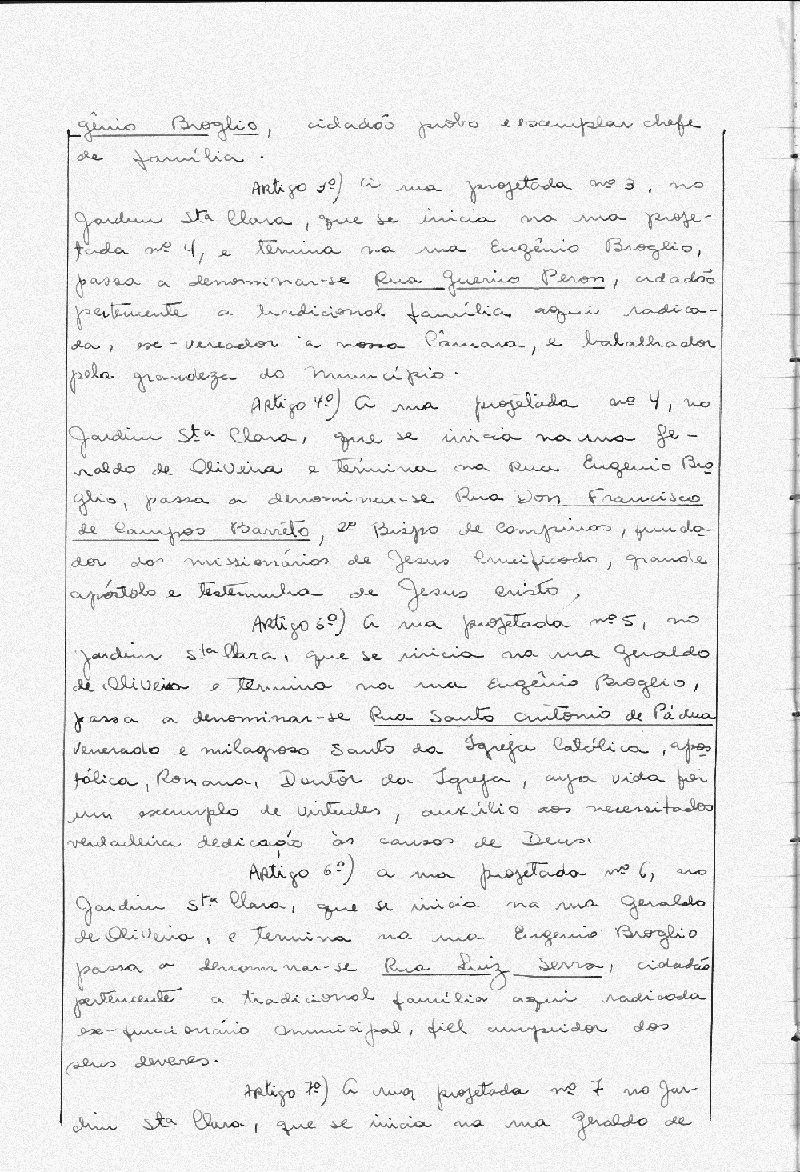 Ementa: Artigo 1° - A Rua Projetada n° 1, no Jardim Sta Clara, que se inicia na Estrada Carlos Gomes-Pedreira, e termina junto ao terreno da Fazenda Sta Clara, passa a denominar-se "Rua Geraldo de Oliveira",