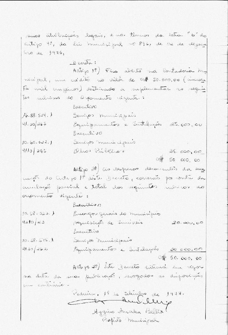Ementa: Artigo 1° - Fica aberto na Contadoria Municipal, um crédito no valor de Cr$ 50.000,00 (cinquenta mil cruzeiros) destinado a suplementar as seguintes rubricas do orçamento vigente