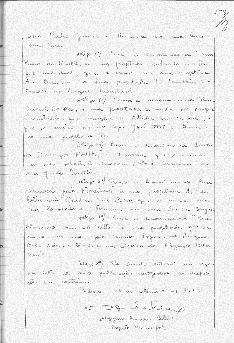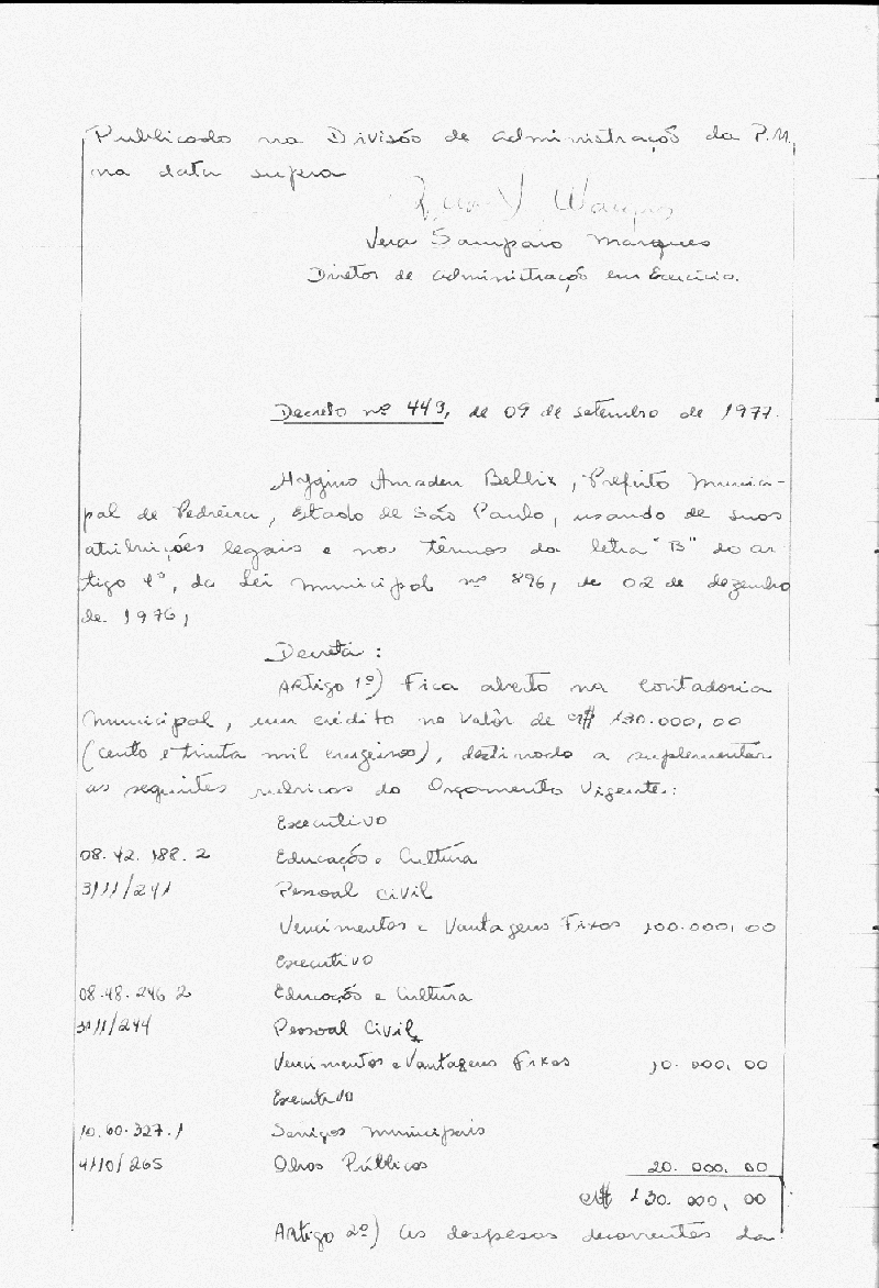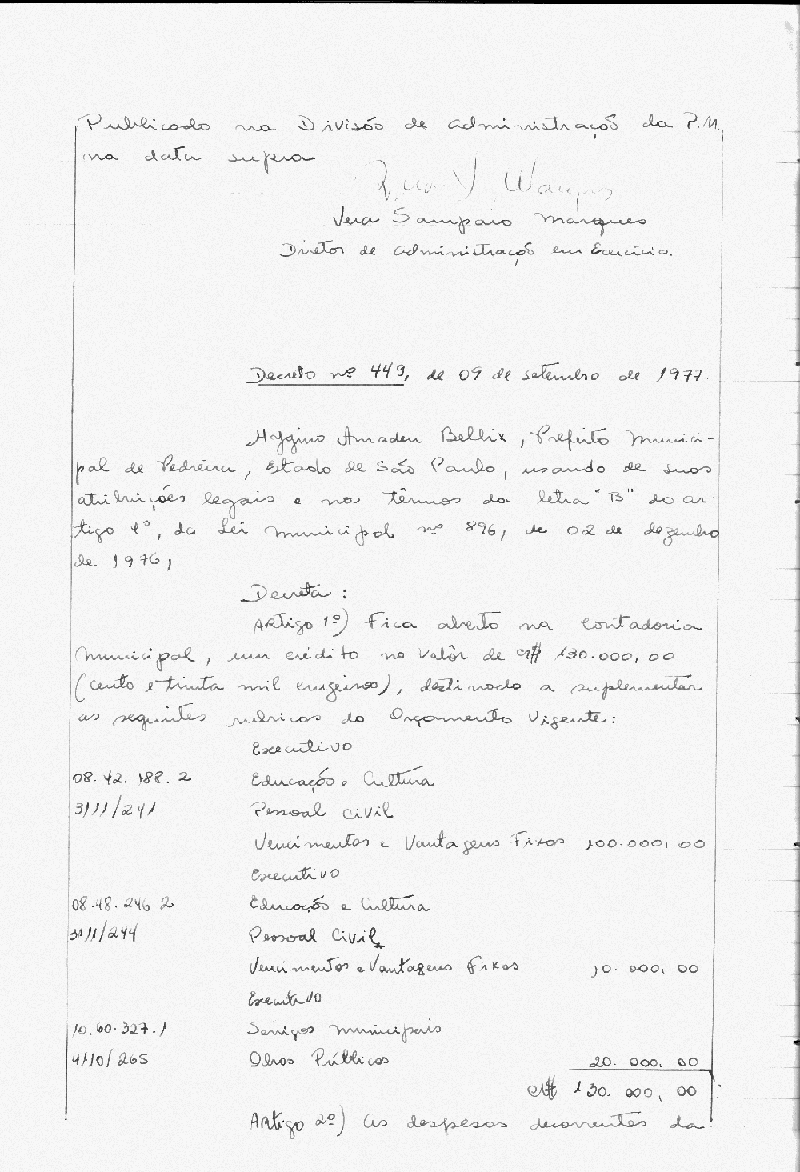 Ementa: Artigo 1° - Fica aberto na Contadoria Municipal, um crédito de Cr$ 130.000,00 (cento e trinta mil cruzeiros) destinados a suplementar as seguintes rubricas do orçamento vigente