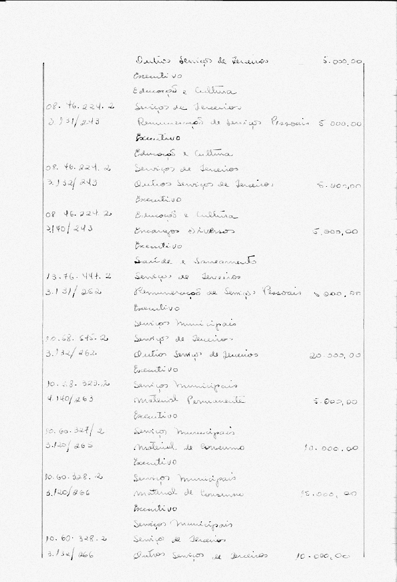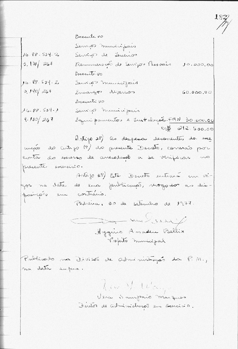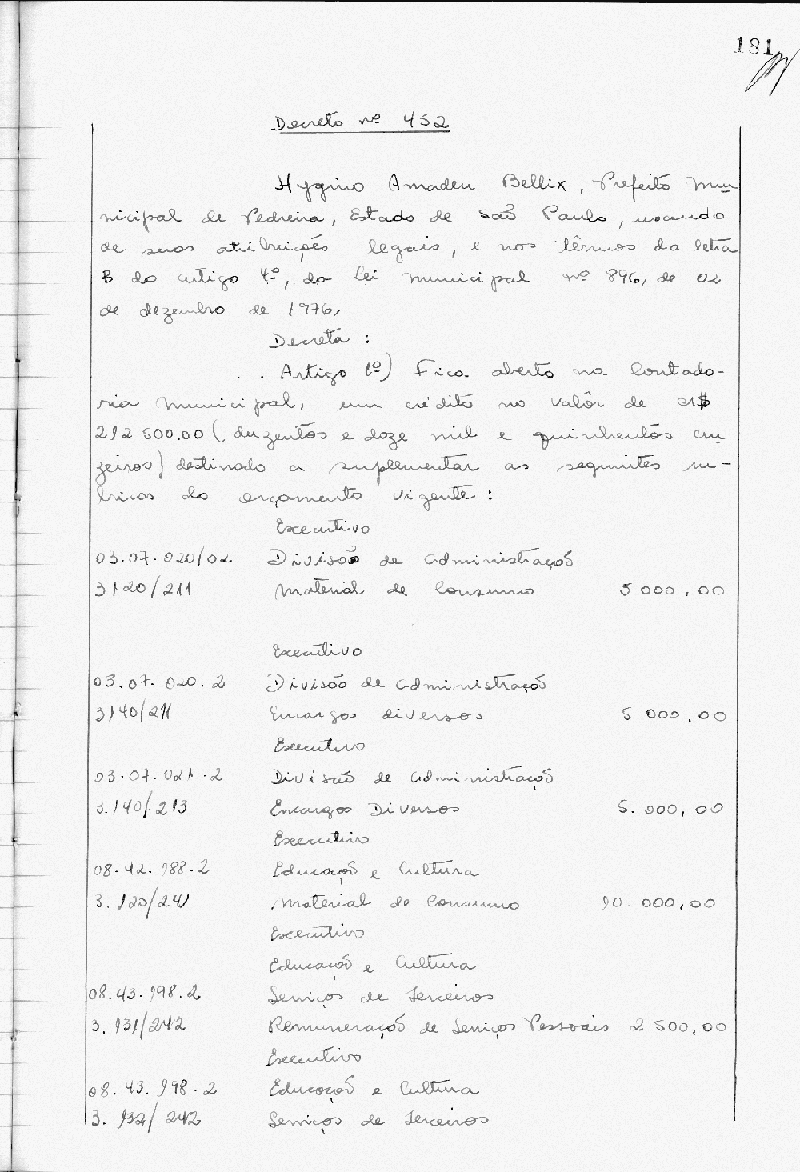 Ementa: Artigo 1° - Fica aberto na Contadoria Municipal, um crédito no valor de Cr$ 212.500,00 (duzentos e doze mil e quinhentos cruzeiros), destinado a suplementar as seguintes rubricas do orçamento vigente