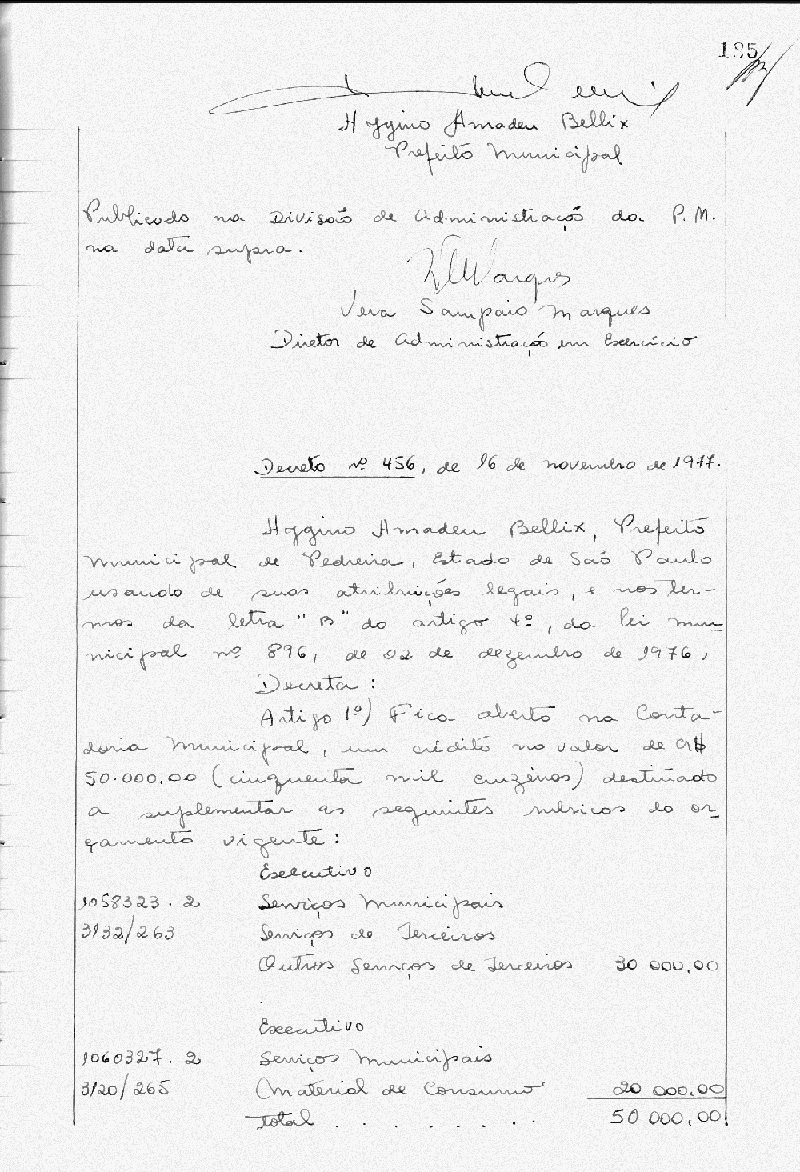 Ementa: Artigo 1° - Fica aberto na Contadoria Municipal, um crédito no valor de Cr$ 155.000,00 (cento e cinquenta e cinco mil cruzeiros), destinado a suplementar as seguintes rubricas do orçamento vigente