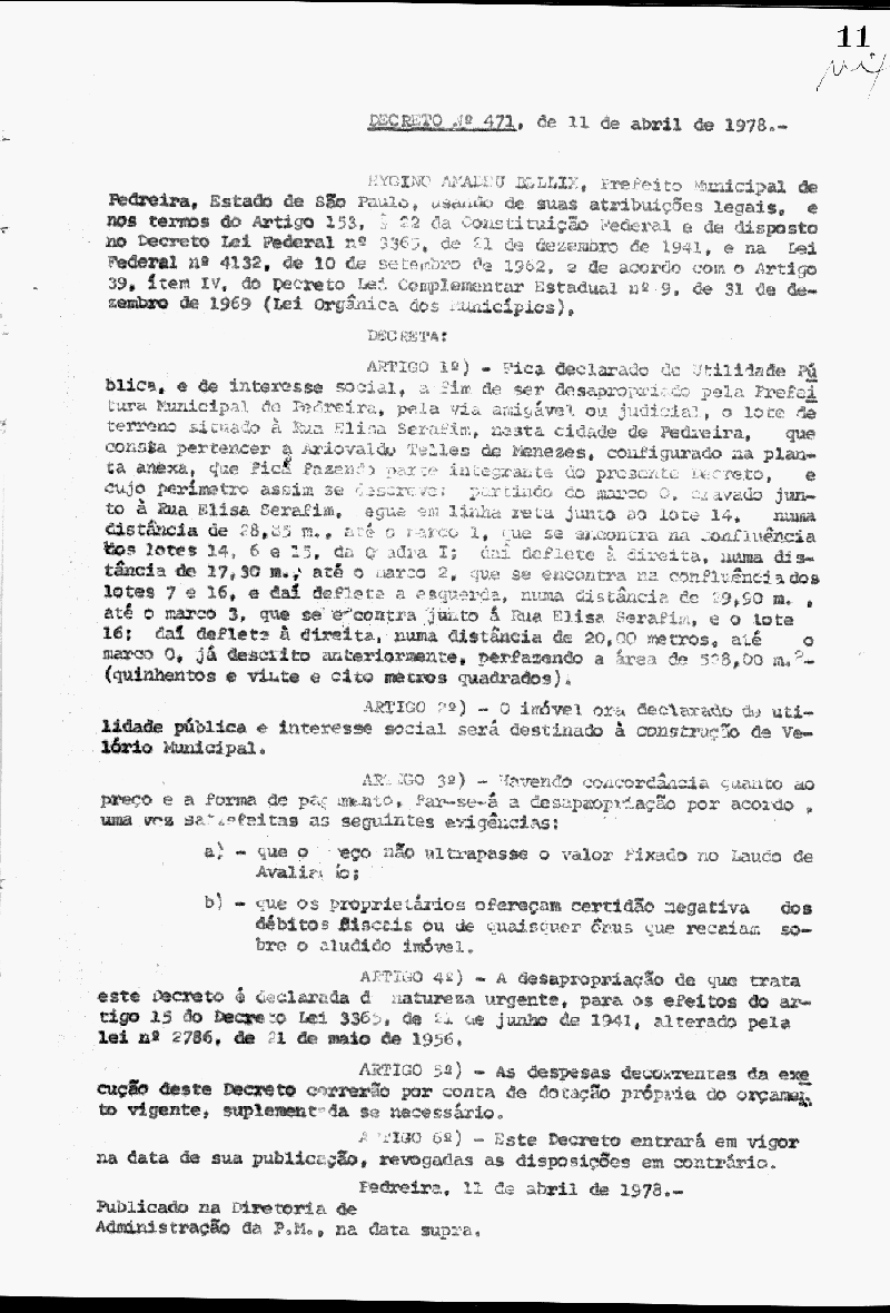 Ementa: Artigo 1° - Fica declarada de Utilidade Pública, a fim de ser desapropriado pela Prefeitura Municipal de Pedreira,