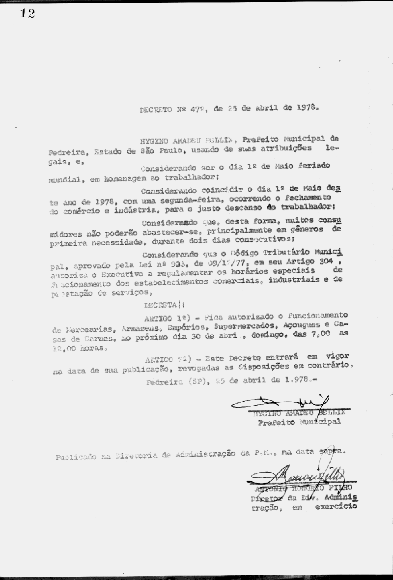Ementa: Artigo 1° - Fica autorizado o funcionamento de Mercearias, Armazéns, Empórios, Supermercados, Açougues e Casas de Carnes, no próximo dia 30 de abril, domingo, das 7:00 as 12:00 horas