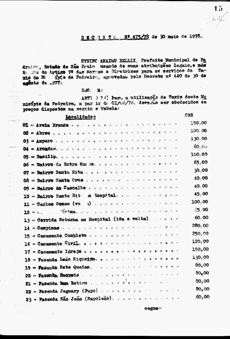Ementa: Artigo 1° - Para a utilização de Taxas deste Município de Pedreira, a partir de 01/06/78, deverão ser obedecidos os preços dispostos na seguinte tabela