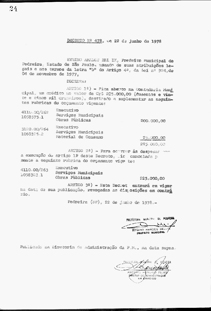 Ementa: Artigo 1° - Fica aberto na Contadoria Municipal, um crédito no valor de Cr$ 225.000,00 (duzentos e vinte e cinco mil cruzeiros), destinados a suplementar as seguintes rubricas do orçamento vigente