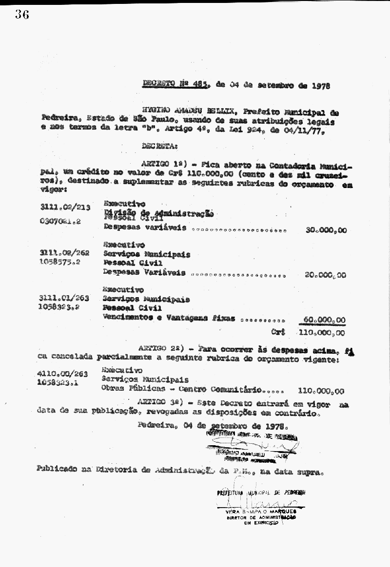 Ementa: Artigo 1° - Fica aberto na Contadoria Municipal, um crédito no valor de Cr$ 110.000,00 (cento e dez mil cruzeiros), destinados a suplementar as seguintes rubricas do orçamento vigente
