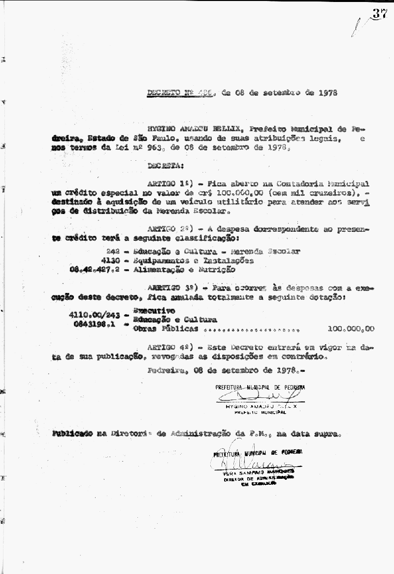Ementa: Artigo 1° - Fica aberto na Contadoria Municipal, um crédito no valor de Cr$ 100.060,00 (cento mil e sessenta cruzeiros), destinados a suplementar as seguintes rubricas do orçamento vigente