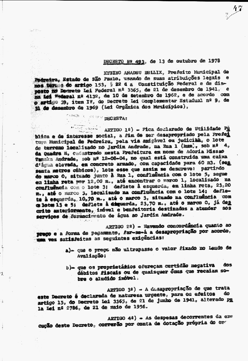 Ementa: Artigo 1° - Fica declarada de utilidade pública, a fim de ser desapropriado pela Prefeitura Municipal de Pedreira, Localizado no Jardim Andrade