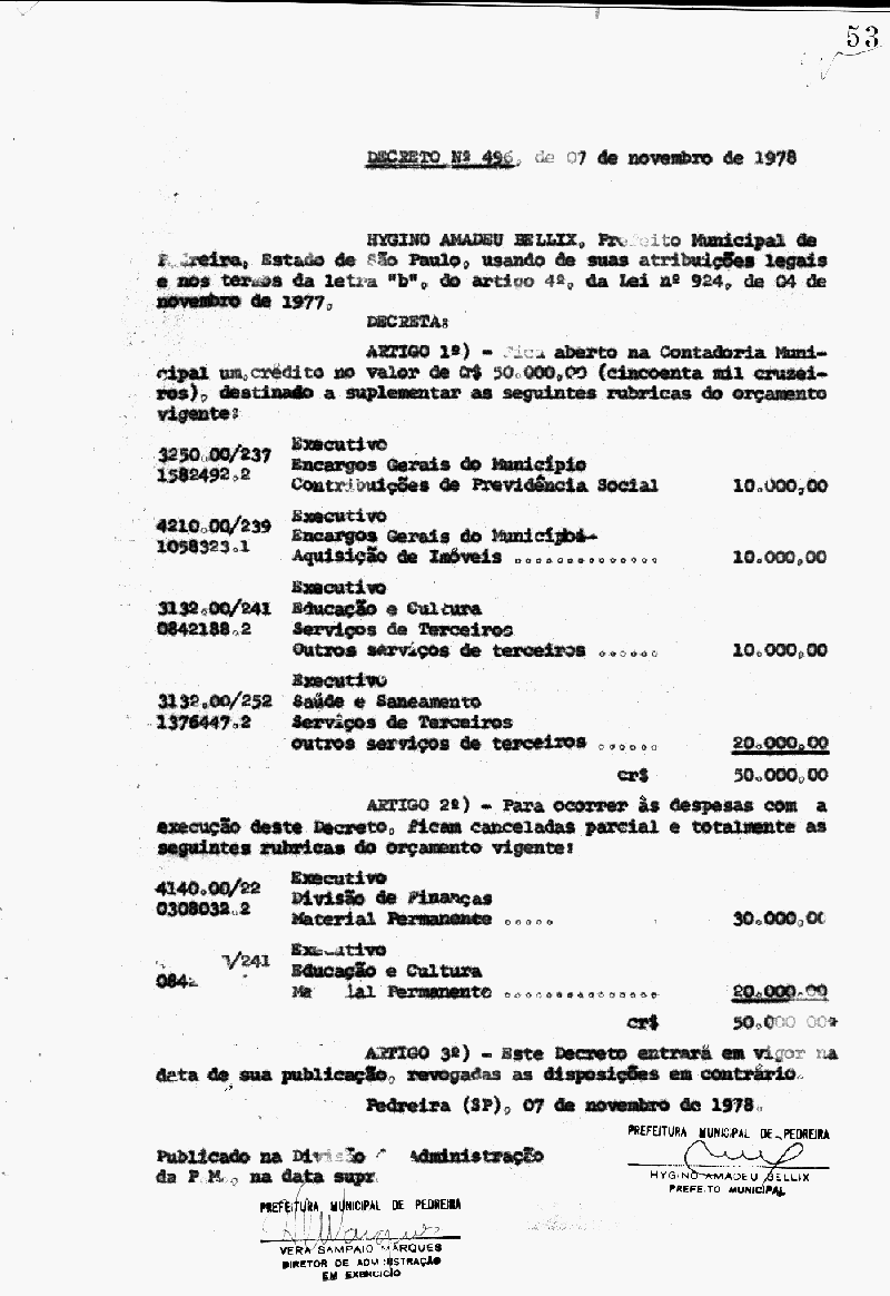 Ementa: Artigo 1° - Fica aberto na Contadoria Municipal, um crédito no valor de Cr$ 50.000,00 (cinquenta mil cruzeiros), destinados a suplementar as seguintes rubricas do orçamento vigente