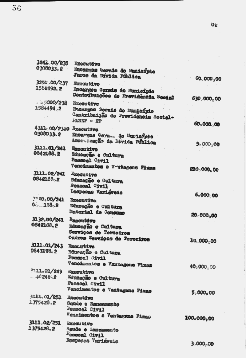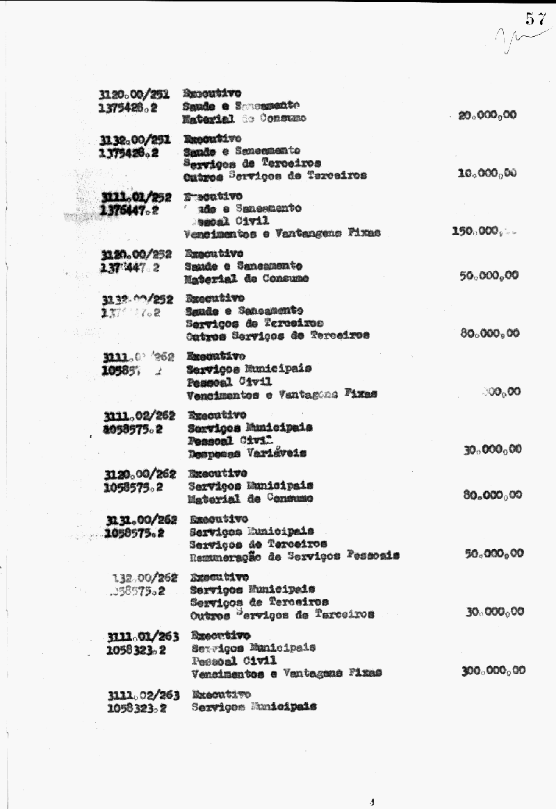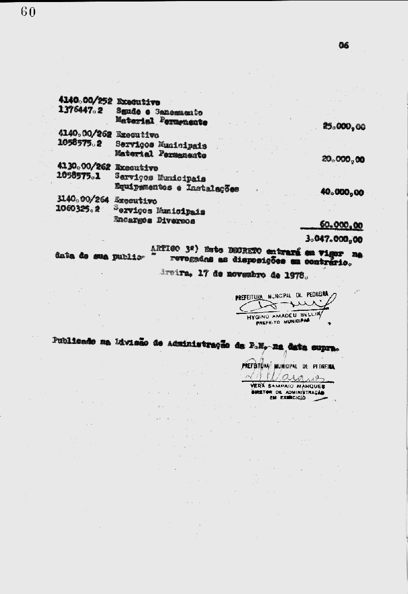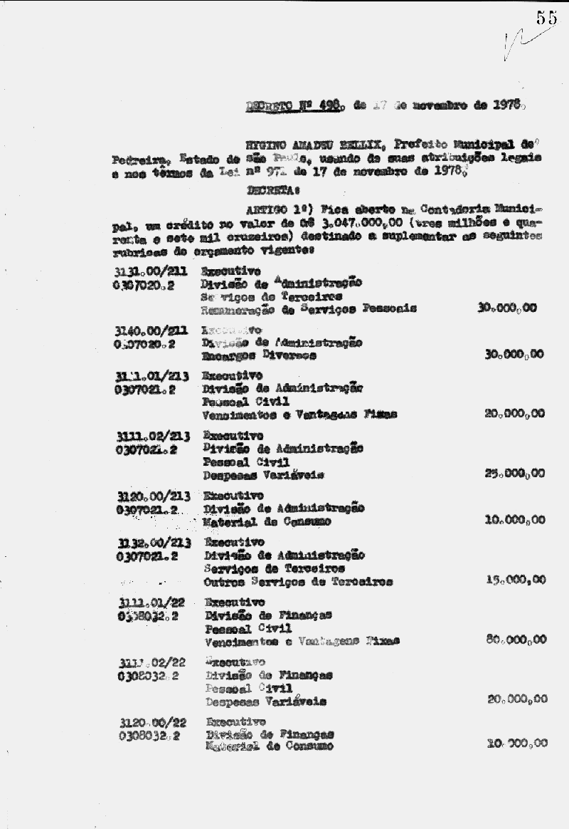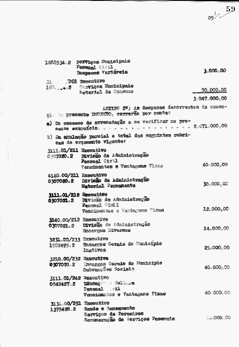 Ementa: Artigo 1° - Fica aberto na Contadoria Municipal, um crédito no valor de Cr$ 3.047.000,00 (três milhões e quarenta e sete mil cruzeiros), destinados a suplementar as seguintes rubricas do orçamento vigente