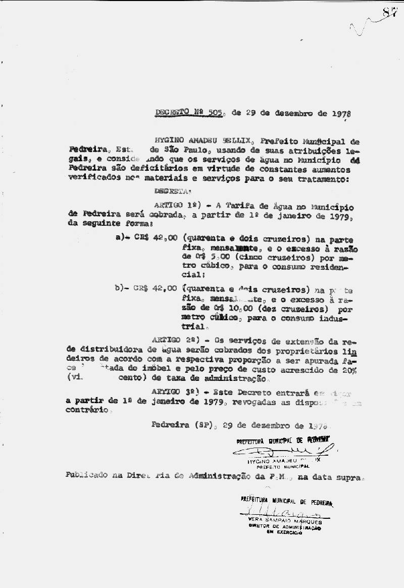 Ementa: Artigo 1° - A tarifa de água no Município de Pedreira será cobrada, a partir de 1° de Janeiro de 1979, da seguinte forma