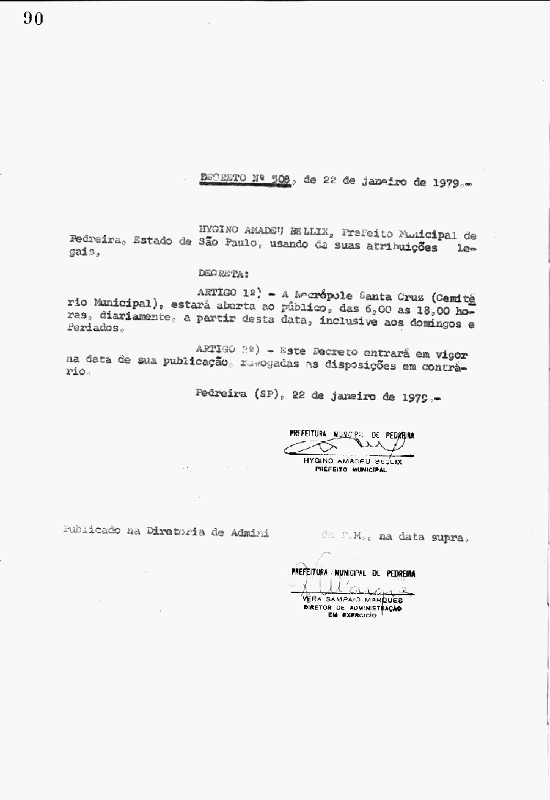 Ementa: Artigo 1° - A Necrópole Santa Cruz (Cemitério Municipal), estará aberta ao público, das 6:00 as 18:00h, diariamente, a partir desta data, inclusive aos domingos e feriados