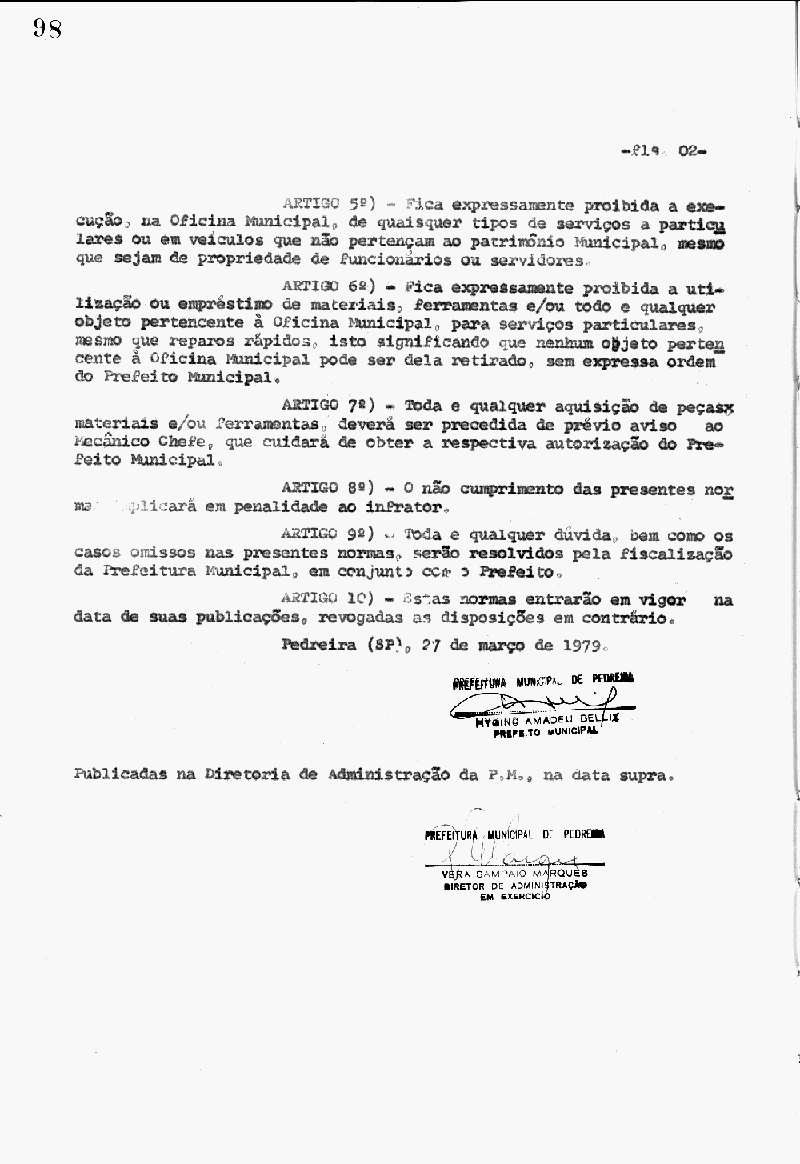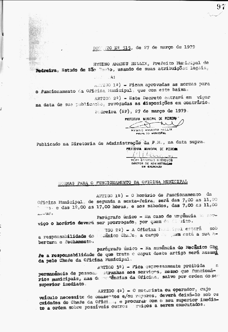 Ementa: Artigo 1° - Fica aprovadas as normas para o funcionamento da Oficina Municipal, que com este baixa