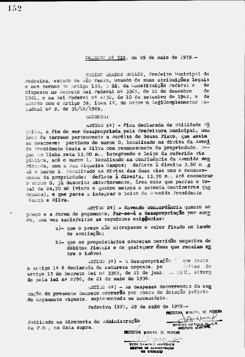 Ementa: Artigo 1° - Fica declarada de Utilidade Pública, a fim de ser desapropriada pela Prefeitura Municipal de Pedreira, uma área de terreno, localizado na divisa da Avenida Presidente Costa e Silva