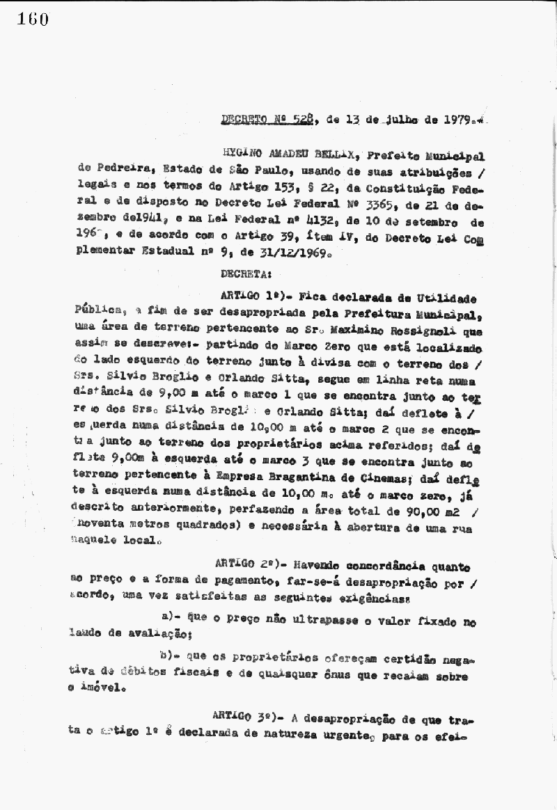 Ementa: Artigo 1° - Fica declarada de utilidade pública, a fim de ser desapropriada pela prefeitura Municipal de Pedreira, uma área de terreno, localizado ao lado esquerdo do terreno