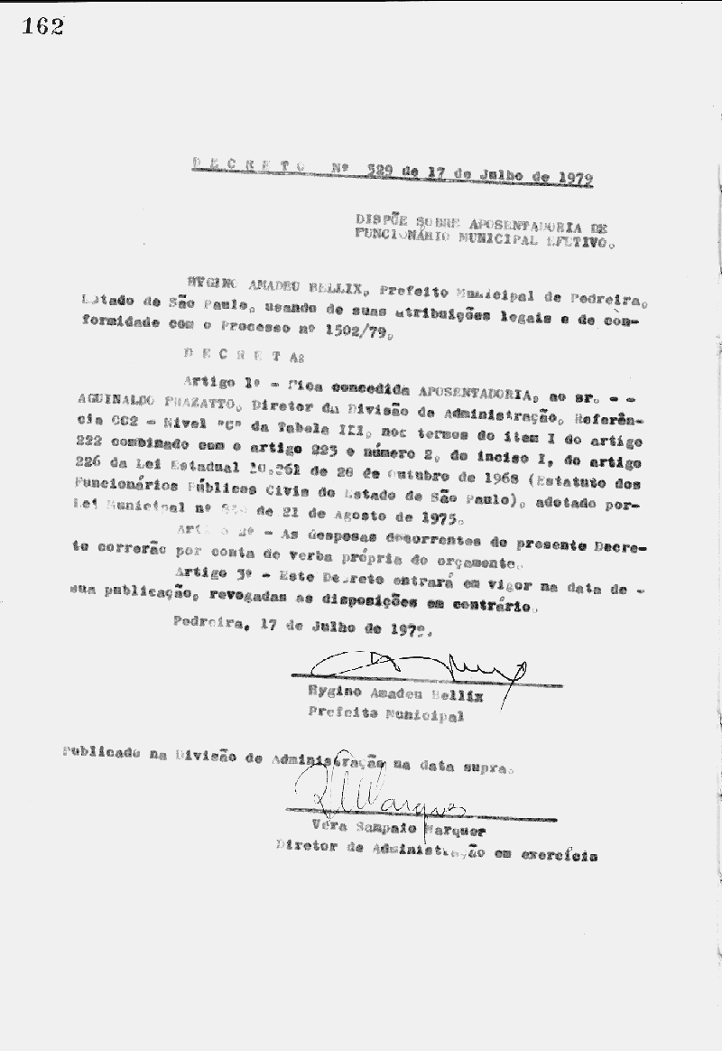 Ementa: Artigo 1° - Fica concedida Aposentadoria, ao Sr. Aguinaldo Phazatto, Diretor da Divisão da Administração,
