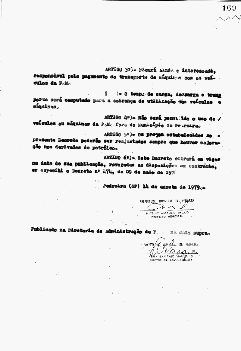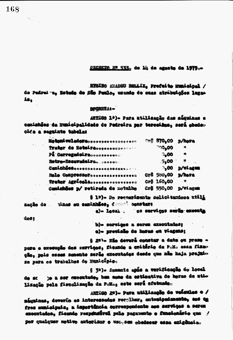 Ementa: Artigo 1° - Para a utilização das máquinas e caminhões de municipalidade de Pedreira por terceiros, será obedecida a seguinte tabela