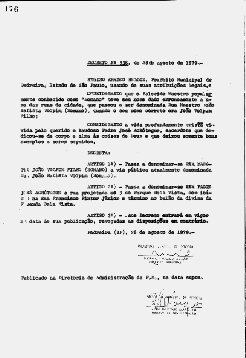 Ementa: Artigo 1° - Passa a denominar-se Rua Maestro João Volpim Filho (Romano) a via pública atualmente denominada Rua João Batista Volpim (Romano)